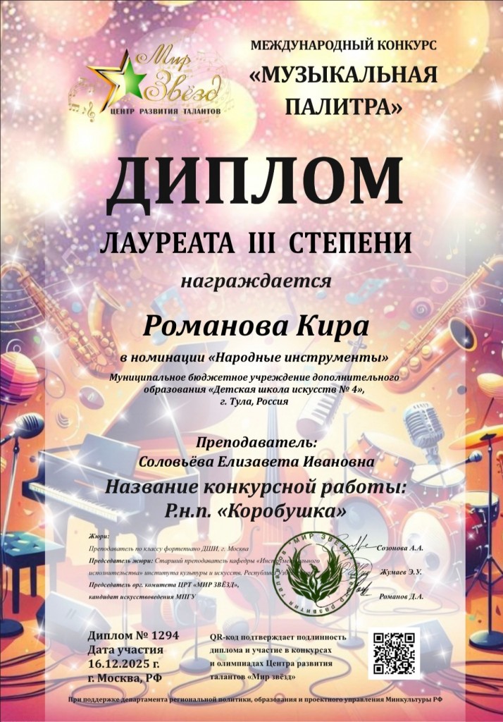 Романова Кира — лауреат III степени в номинации «Народные инструменты» (аккордеон)! Преподаватель: Соловьёва Е. И.