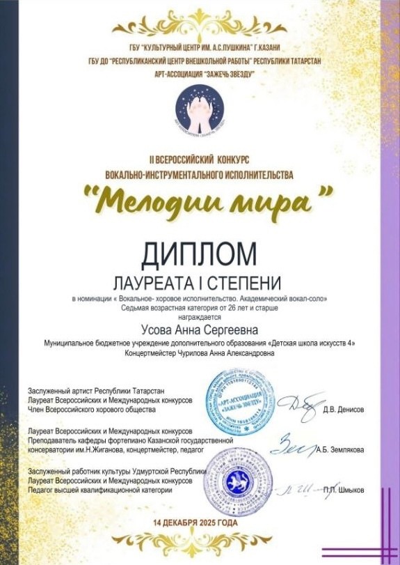 Усова Анна Сергеевна и концертмейстер Чурилова Анна Александровна — победители?II?Всероссийского конкурса вокально?инструментального исполнительства «Мелодии мира» в номинации «Академический вокал — соло»!